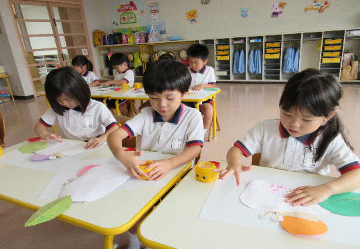 ゆり組は、6月の製作”傘とレインコートを着た、ぼく・わたし”を、先日、絵の具で雨を降らせた台紙に貼りました。